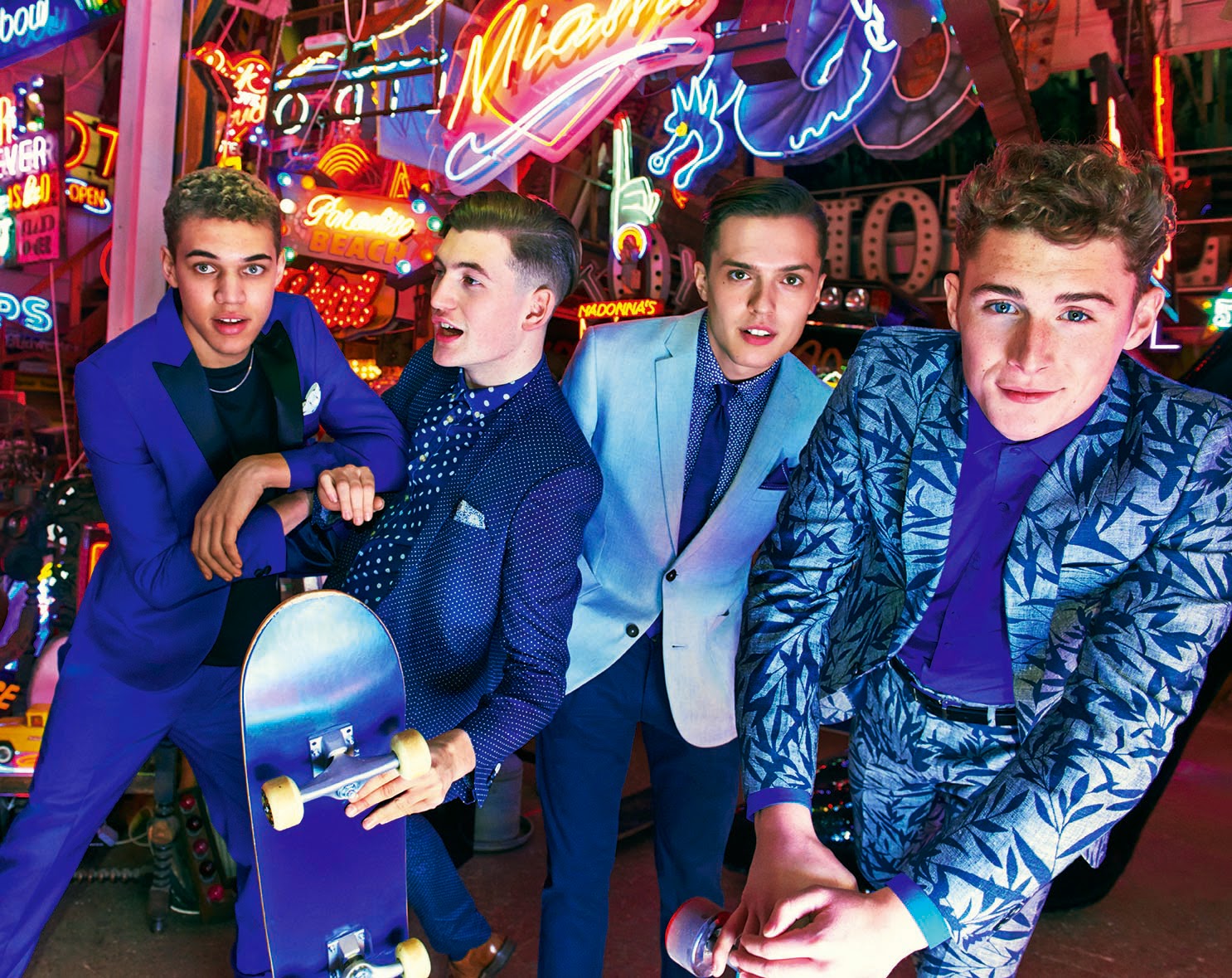 From our summer blues theme, left to right; Moss London Bright Blue Dress Suit, Navy Spot Print Suit, Sky Blue Jacket, Tropical Print Suit.